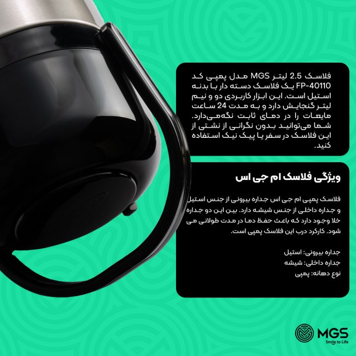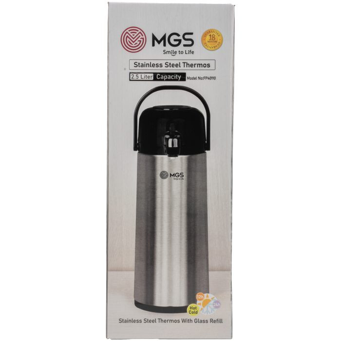 فلاسک 2.5 لیتر MGS مدل پمپی یک فلاسک دسته دار با بدنه استیل است. این ابزار کاربردی دو و نیم لیتر گنجایش دارد و به مدت 24 ساعت مایعات را در دمای ثابت نگهمیدارد. شما میتوانید بدون نگرانی از نشتی از این فلاسک در سفر یا پیک نیک استفاده کنید.